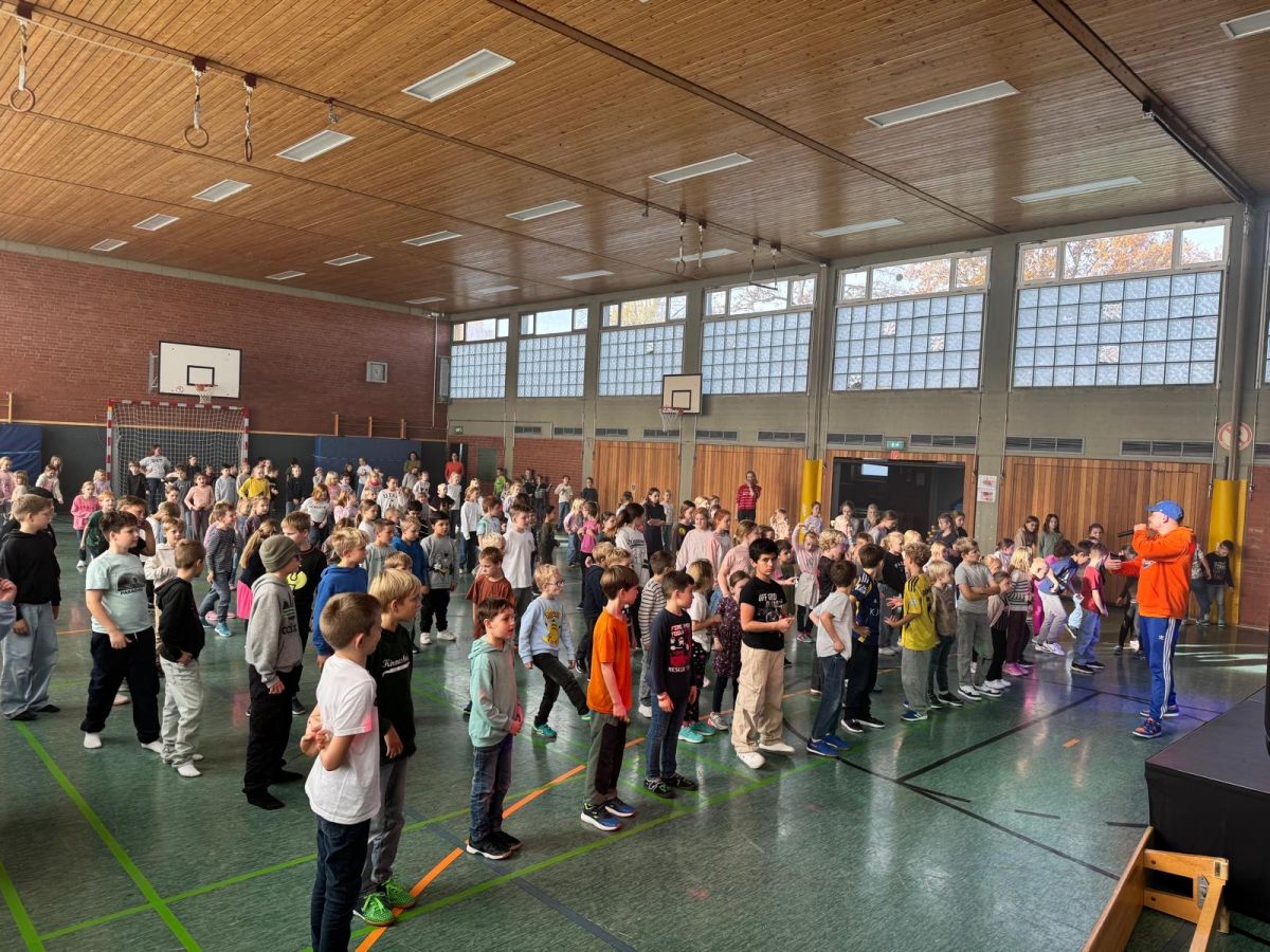 Zur Herbstfeier versammelten sich alle Schülerinnen und Schüler in der Turnhalle und feierten mit einem bunten Programm.