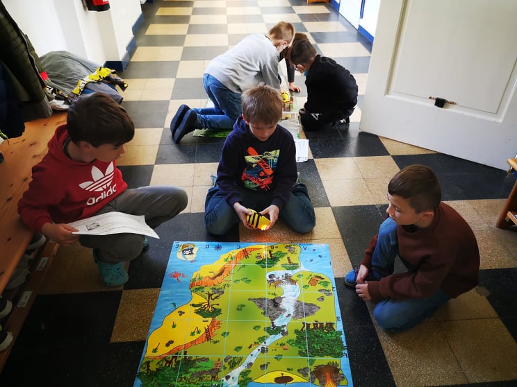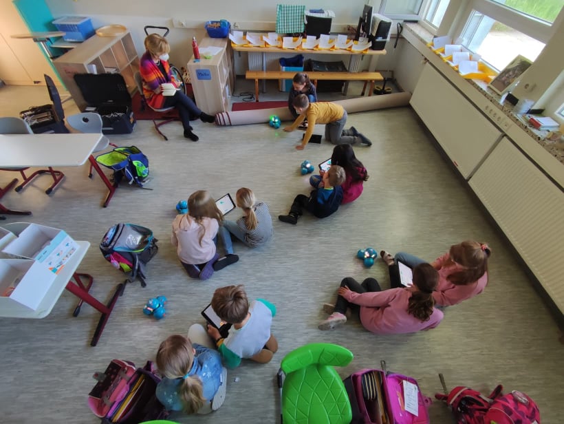 Im Rahmen der ROBOTIK-Woche durften die Kinder der Jahrgänge 2 - 4 in dieser Woche Roboter programmieren. Das zweite Schuljahr nutzte hierfür sogenannte "Bee-Bots". Dabei handelt es sich um einen kleinen Bienenroboter, der mit Hilfe von Tasten auf dem Roboter programmiert werden kann. Die Klassen der Jahrgänge 3 und 4 durften mit Hilfe einer App einen "Dash"-Roboter programmieren.