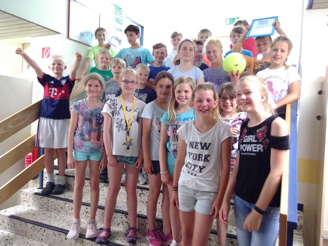 Am 12. Juni machten sich die Kinder aller Jahrgangsstufen gemeinsam mit dem Bus auf den Weg ins Soester Jahnstadion. Dort fanden bei idealen Wetterbedingungen die diesjährigen Bundesjugendspiele statt. Nach einer gemeinsamen Erwärmung zu Musik, konnten die Kinder in den Disziplinen Weitsprung, Sprint, Schlagballwurf und Ausdauerlauf ihr Können unter Beweis stellen. Durch die tatkräftige Unterstützung vieler Eltern verlief der sportliche Morgen reibungslos.