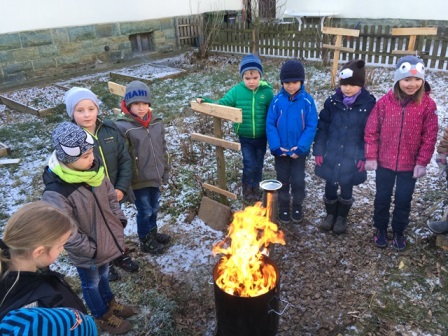 Passend zum Thema Hexen nutzte die Klasse 1a das schöne kalte Winterwetter, um sich am Hexenfeuer im Schulgarten zu wärmen.