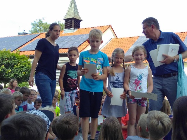 Wie immer trafen wir uns auf dem Schulhof. Dort wurden auf der Tischtennisplatte unsere erfolgreichen Sportlerinnen und Sportler geehrt.